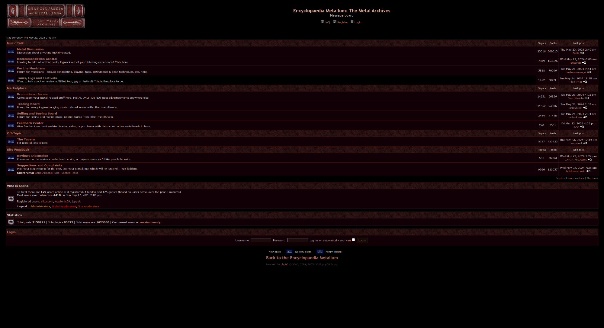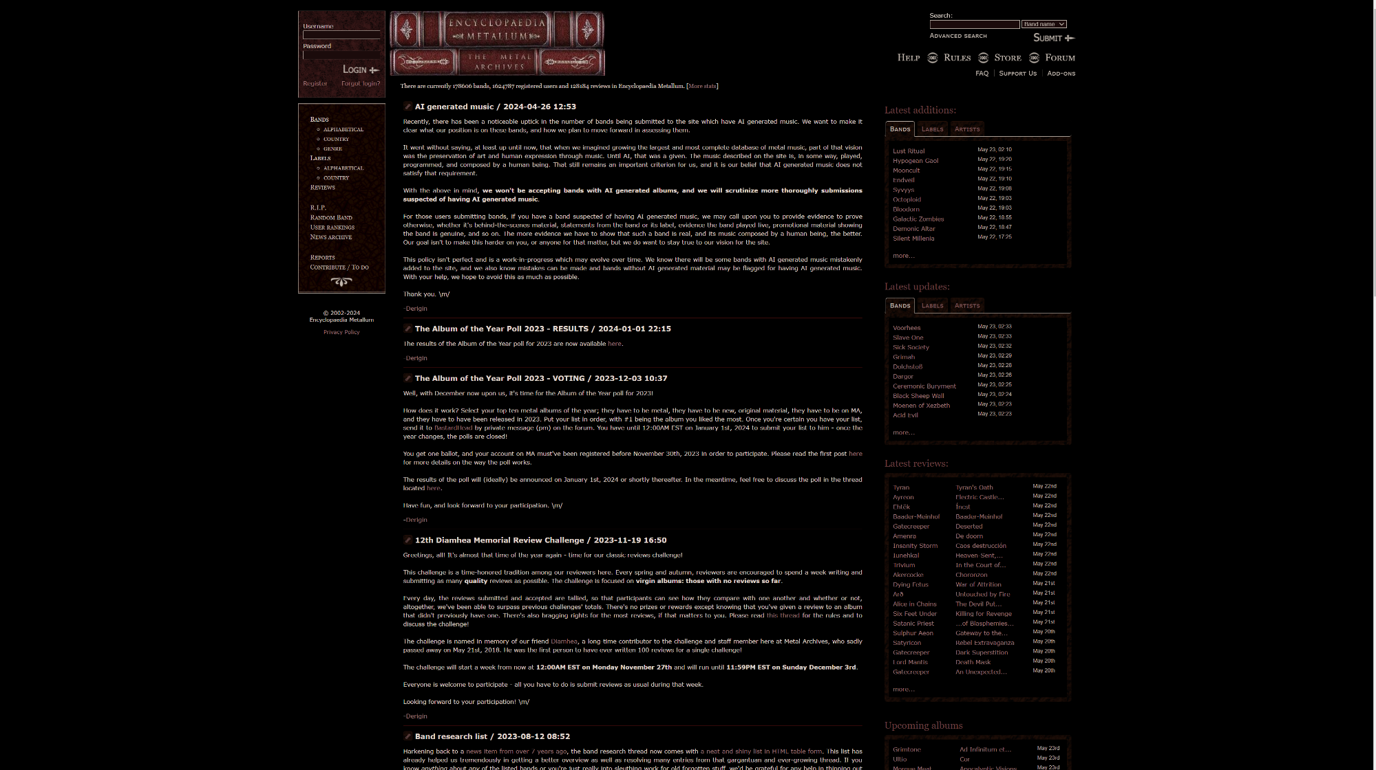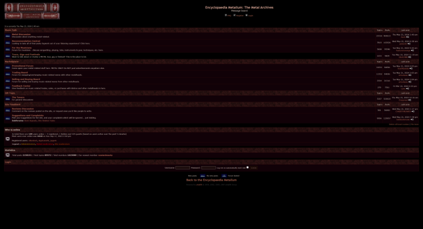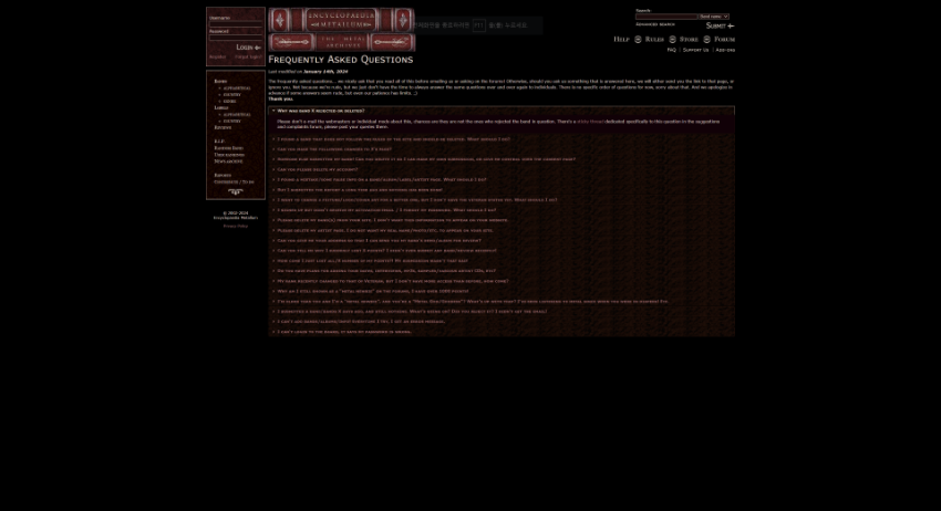 헤비 메탈 음악 팬들을 위한 공간입니다. 메탈 아카이브는 전 세계의 메탈 밴드의 디스코그래피, 멤버정보, 약력, 앨범 리뷰, 기타 관련 자료등을 제공합니다. 아카이브 이용자들은 밴드 정보를 검색하고, 앨범에 대한 리뷰를 읽고, 새로운 메탈 음악을 발견할 수 있습니다. Metal Archives는 포럼 등의 커뮤니티 기능도 제공하여 사용자들이 직접 밴드와 앨범 정보를 추가하고 업데이트 할 수 있는 기능을 제공합니다.