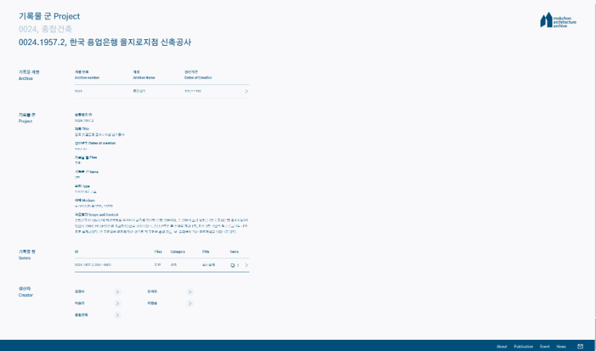 목천건축아카이브는 재단법인 목천문화재단이 진행하는 주요 건축문화기반사업의 일환으로 설립되었습니다. 비영리법인과 건축가, 건축학자들의 자발적인 모임으로, 한국의 근·현대 건축기록물을 수집·보존·활용하는 역할을 한다고 합니다. 2010년부터 건축가의 구술채록사업과 건축가, 건축물 단위의 기록물 수집 활동을 진행하고 있으며 이를 토대로 연구, 출간, 세미나, 비평 활동을 진행하고 있습니다. 목천건축아카이브 운영위원회는 배형민(서울시립대학교), 전봉희(서울대학교), 우동선(한국예술종합학교), 최원준(숭실대학교) 으로 구성되어있습니다.