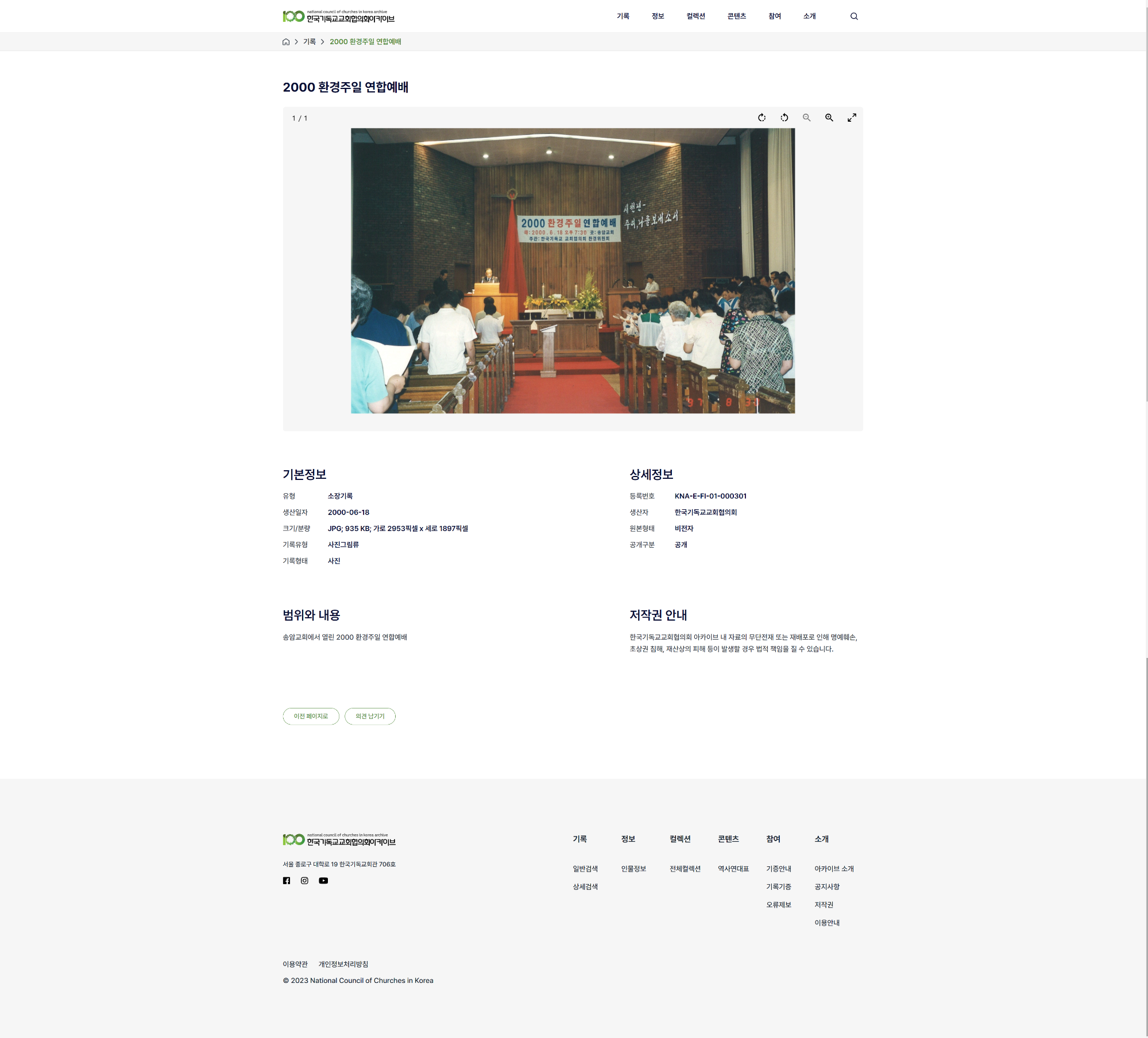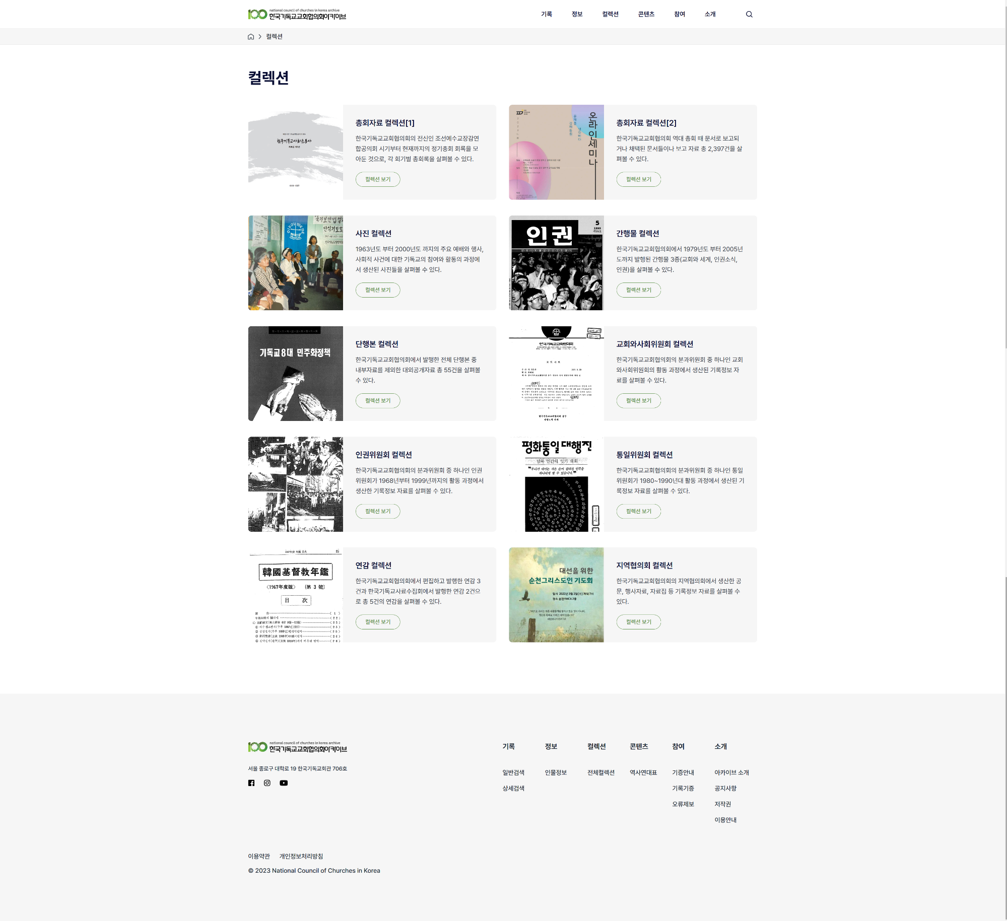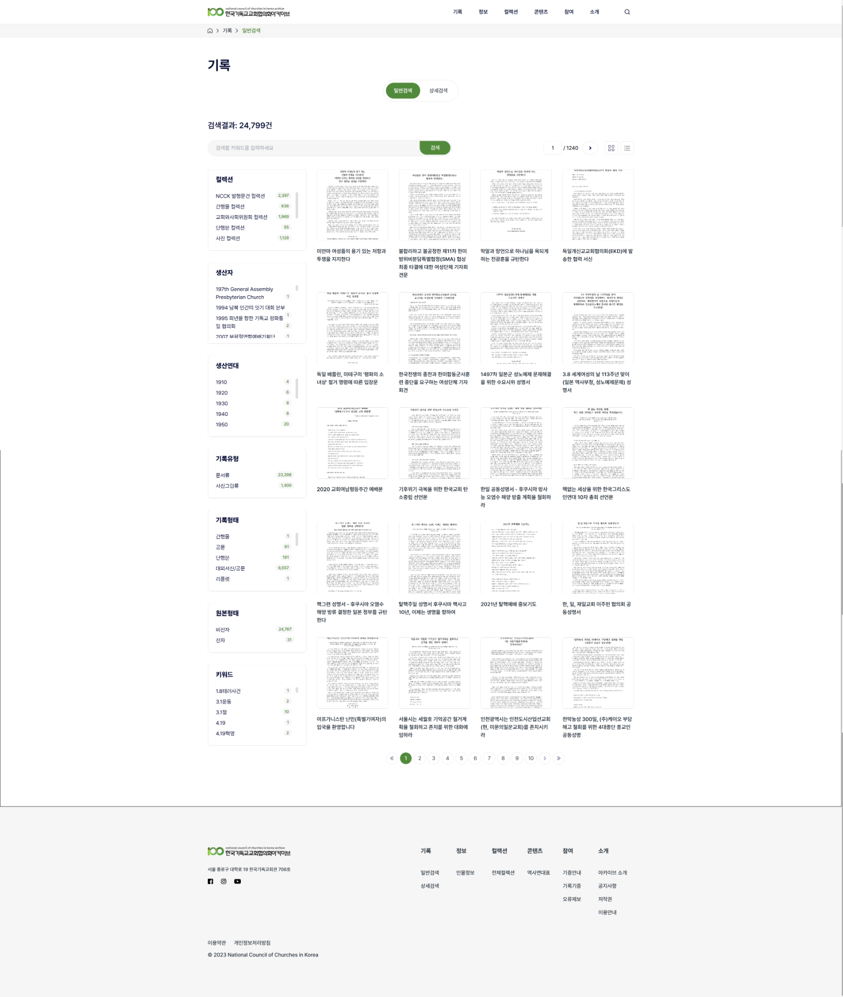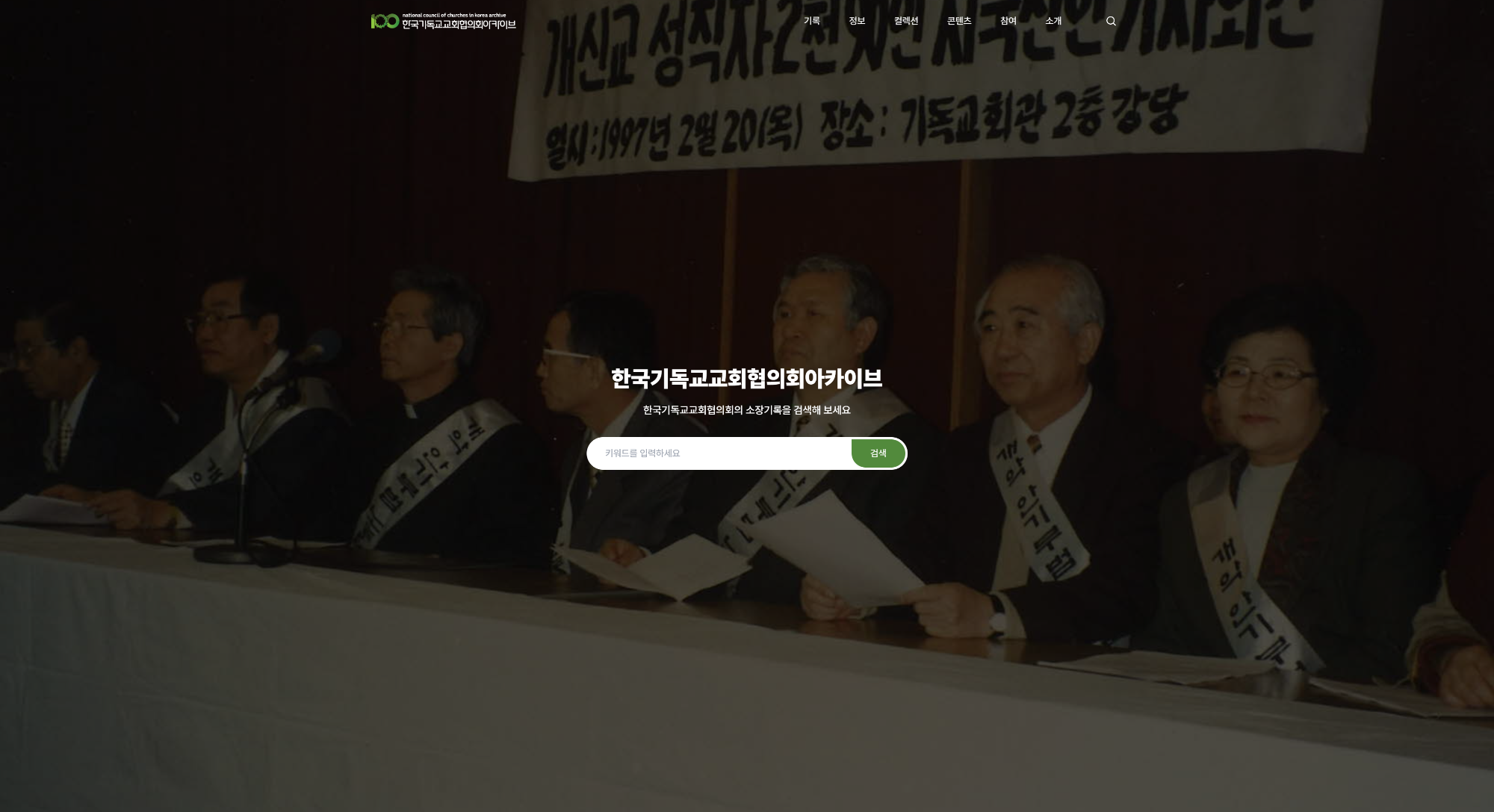 한국기독교교회협의회는 국내외 에큐메니칼 운동, 기독교 사회운동 등 다양한 개신교 관련 자료를 수집・관리하고 연구자와 시민에게 서비스하기 위해 한국기독교교회협의회 아카이브를 운영하고 있습니다.1924년에 창립된 교회협 100주년 기념사업을 위해 조직된 ‘NCCK100주년기념사업특별위원회’가 문화체육관광부의 후원을 받아 진행하고 있는 “한국기독교교회협의회 100주년 기념 기독교사회운동사 정리보존사업”의 일환으로 구축되었습니다. 본 아카이브에는 교회협의 역대 총회록, 간행물(「인권」, 「인권소식」, 「교회와 세계」 등), 교회협이 출간한 단행본, 각종 사진 자료 등 1910년대에서 현대까지의 사료가 2만 건 이상(2024.6.14. 현재) 공개되어 있습니다.