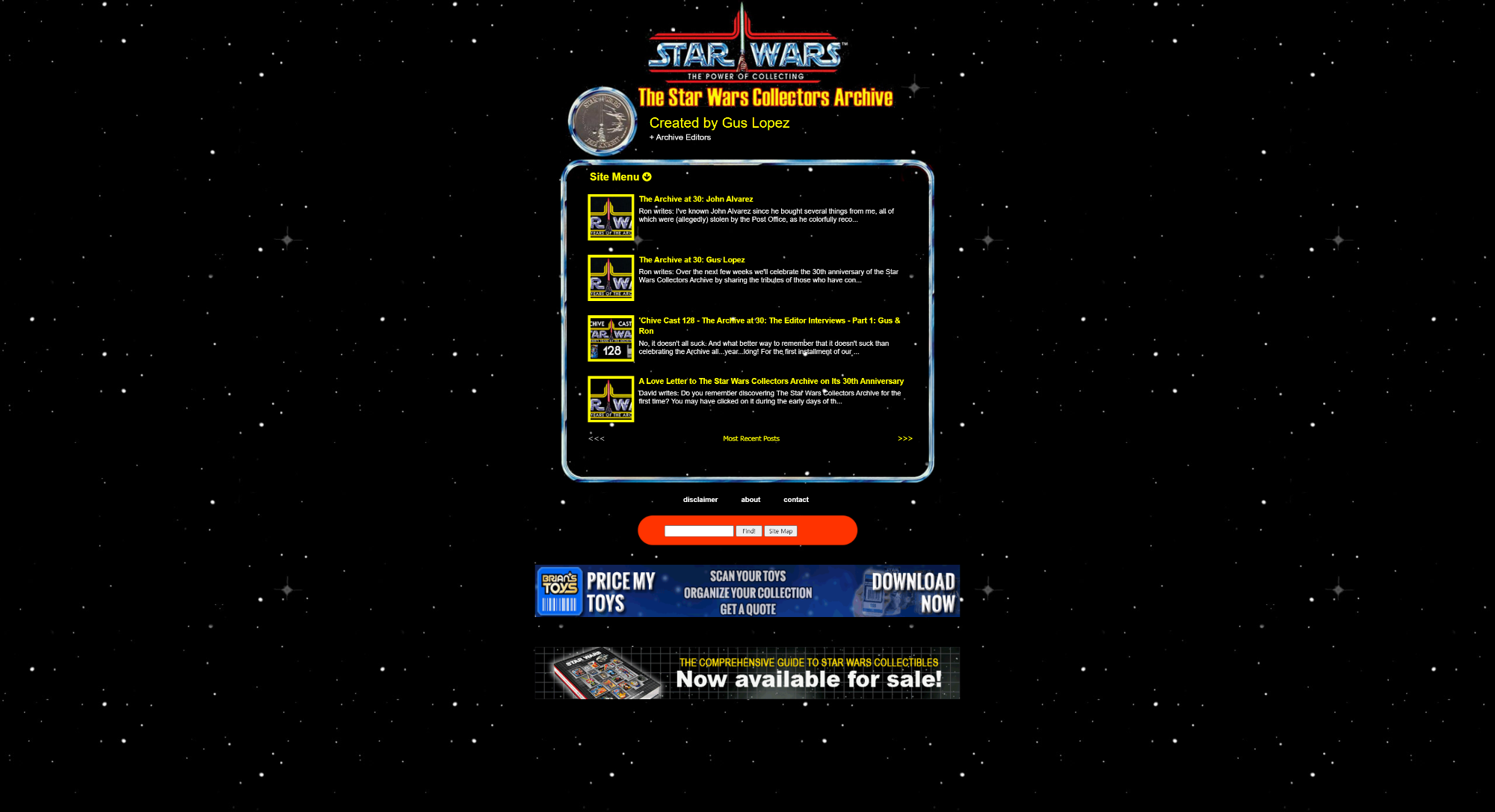 1994년에 시작된 스타워즈 컬렉터 아카이브는 인터넷 최초의 스타워즈 수집 사이트입니다. 이 사이트는 수집가들 사이의 지리적 거리를 웹을 통해 좁히기 위해 만들어졌습니다. 사이트의 모습과 기능은 시간이 지나면서 변했지만, 그 의도는 변하지 않았습니다. 세계 최고의 스타워즈 컬렉션을 소개하면서 수집가들을 교육하는 것입니다. 이곳에서의 경험이 재미있고 유익하기를 바라며, 저희와 스타워즈 수집 커뮤니티가 새로운 기능과 콘텐츠를 계속 추가함에 따라 자주 방문해 주시기를 바랍니다.