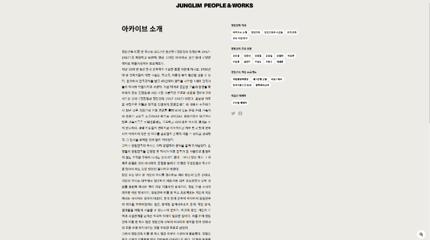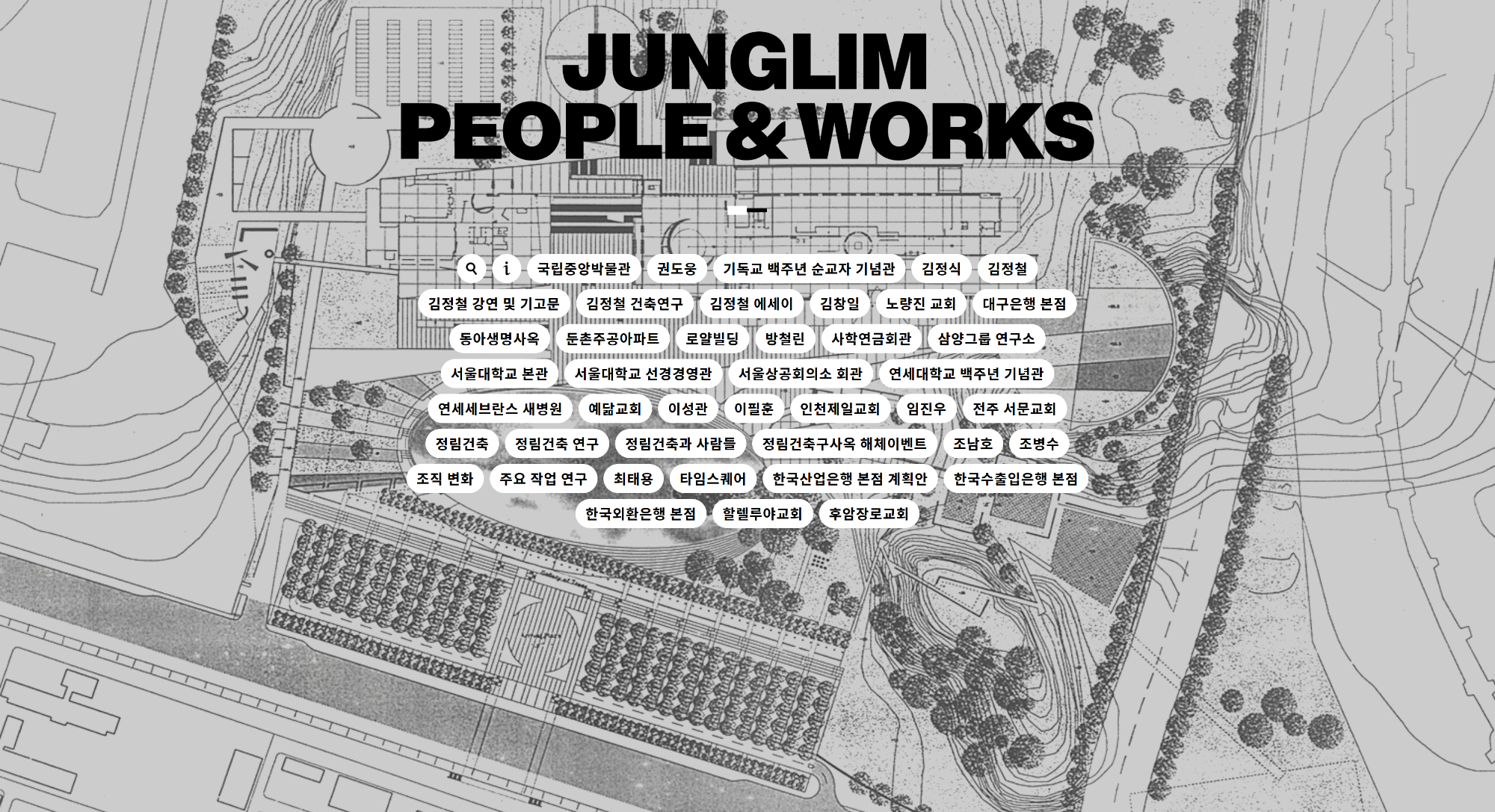 국립중앙박물관, 대구은행 본점, 타임스퀘어, 한국외환은행 본점 등을 건축한 정림건축의 아카이브. 정림건축 피플 앤 웍스는 2017년 출간된 <김정철과 정림건축 1967~1987>을 확장하고 보완해, 영상, 디지털 아카이브, 출간 등의 다양한 매체로 퍼블리싱하는 프로젝트이다.