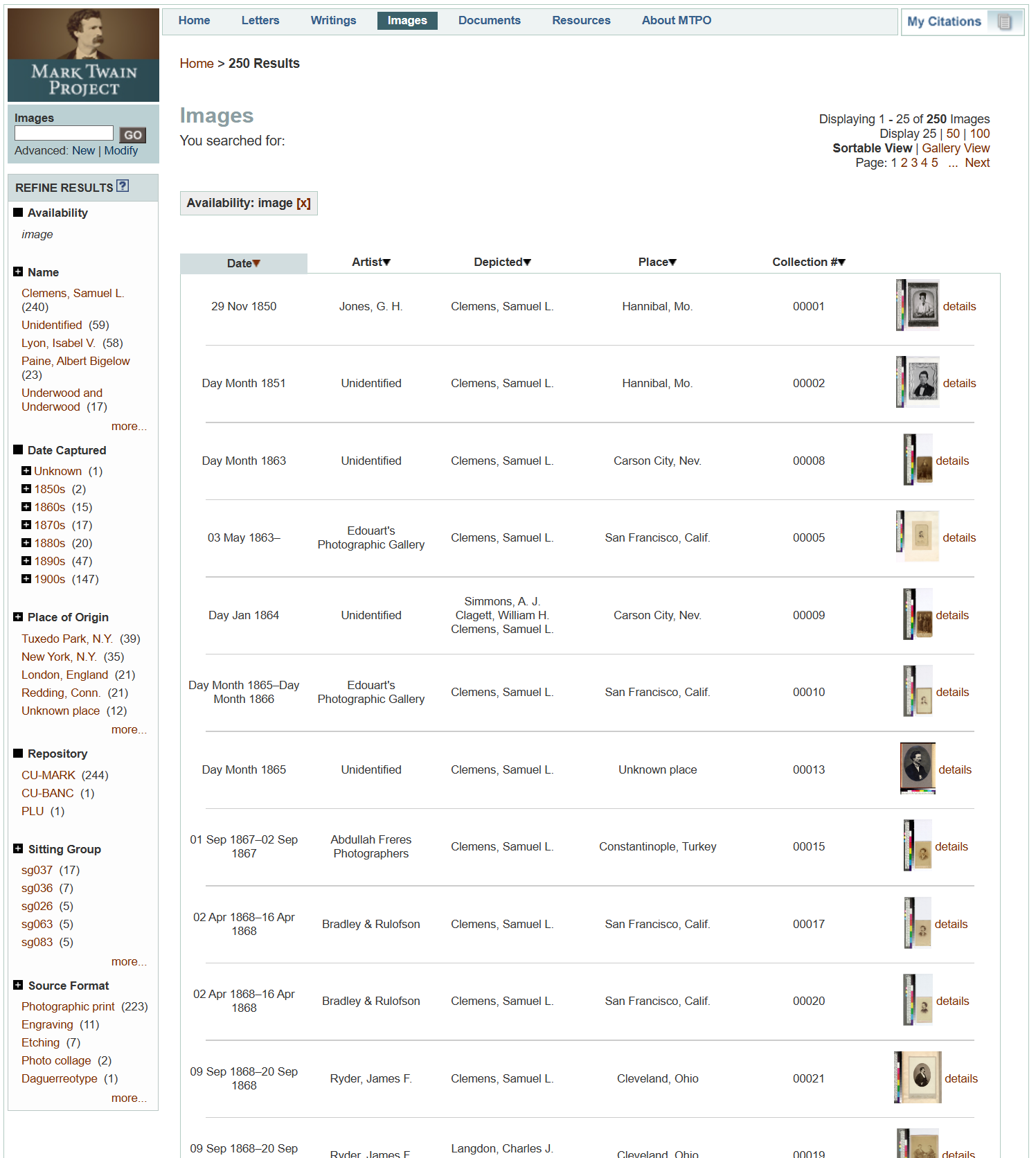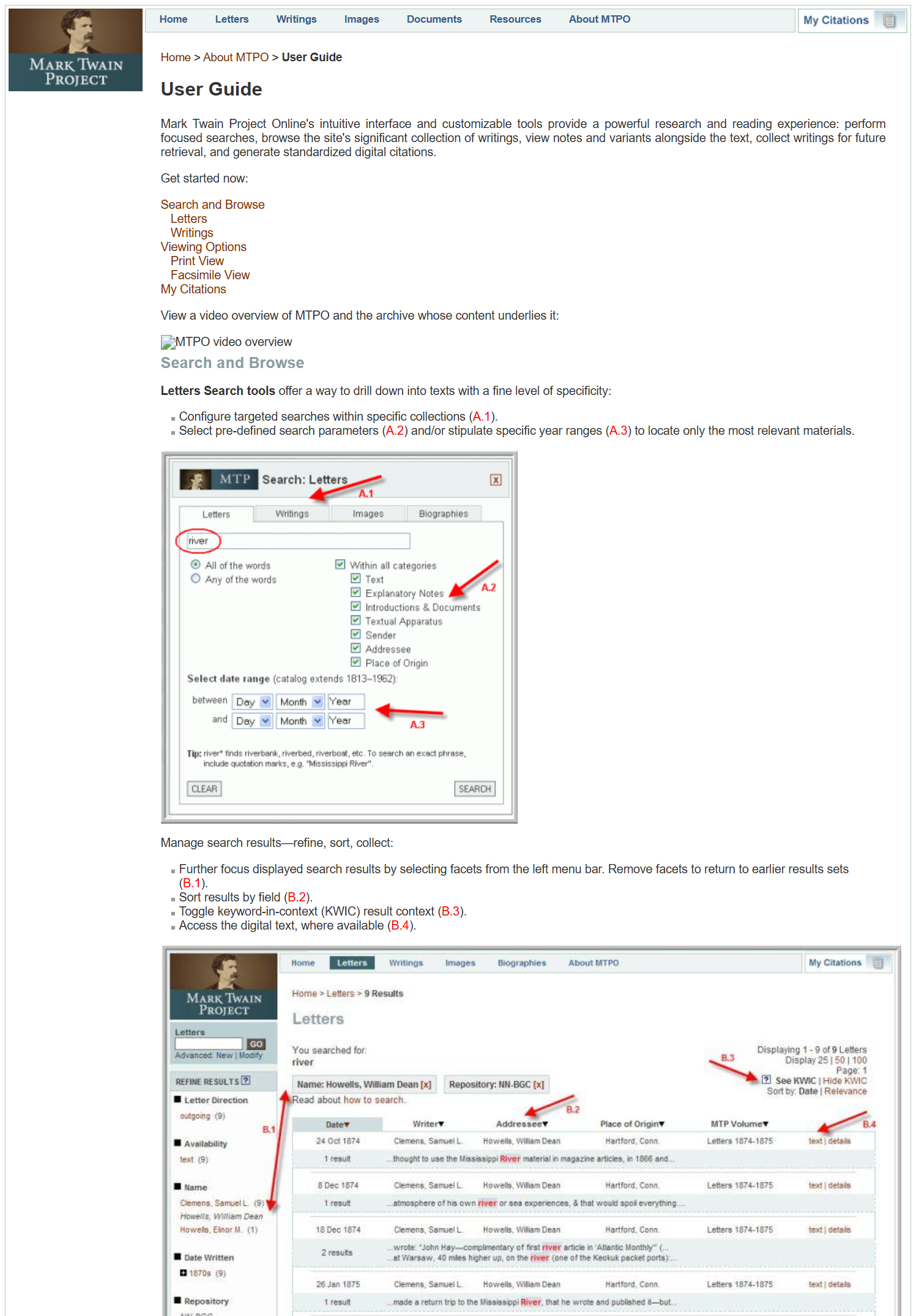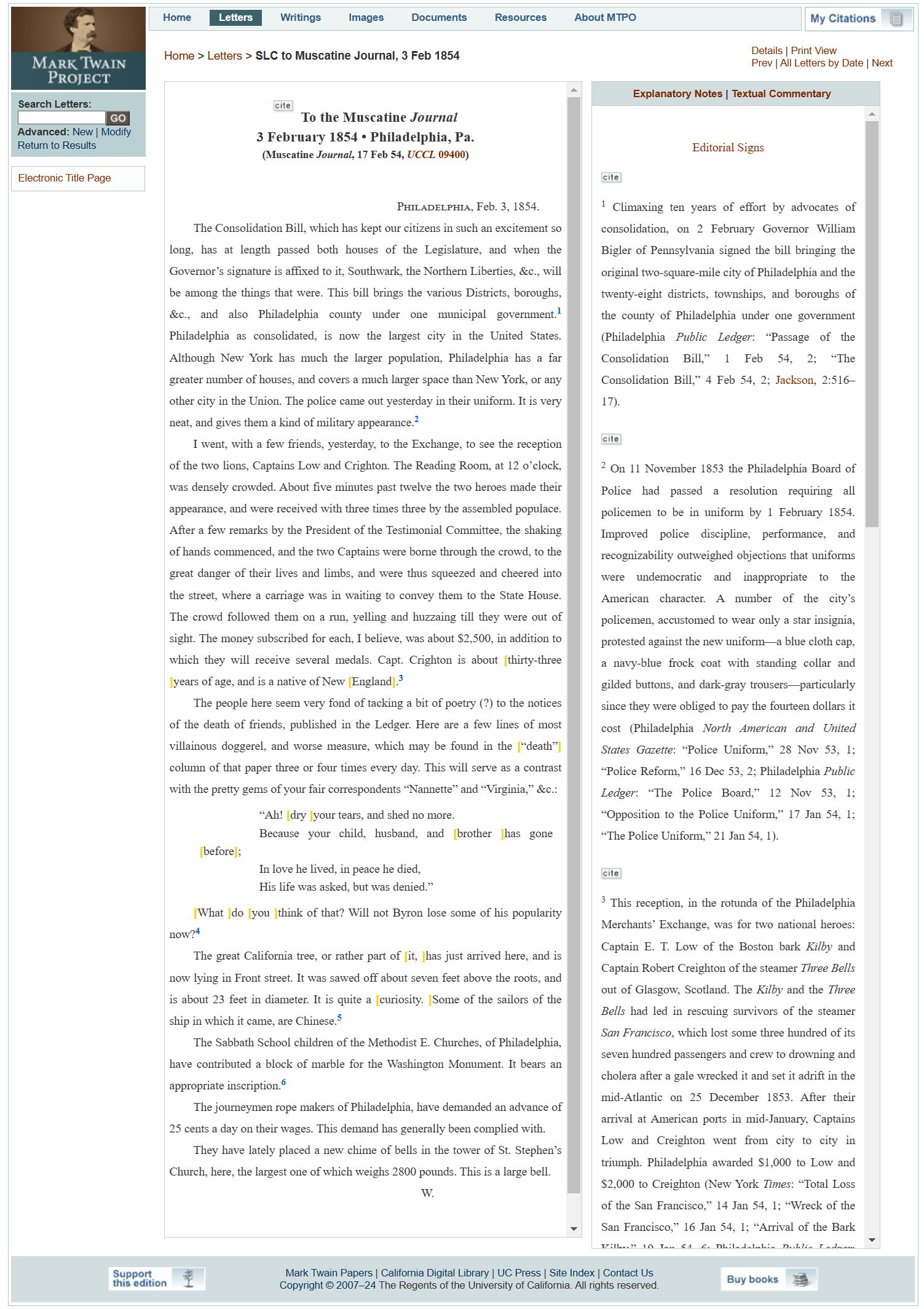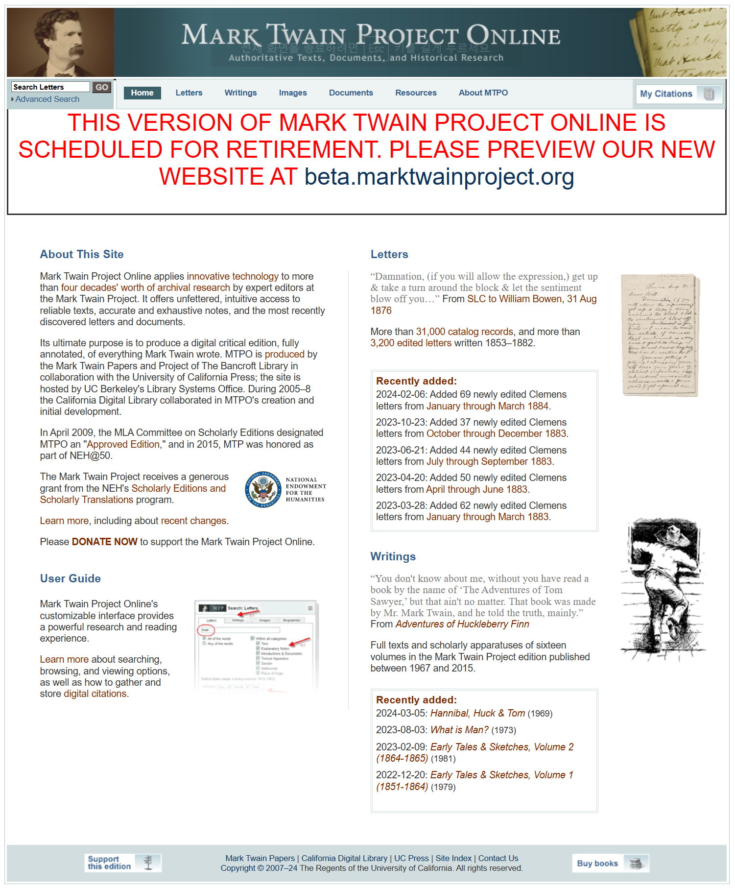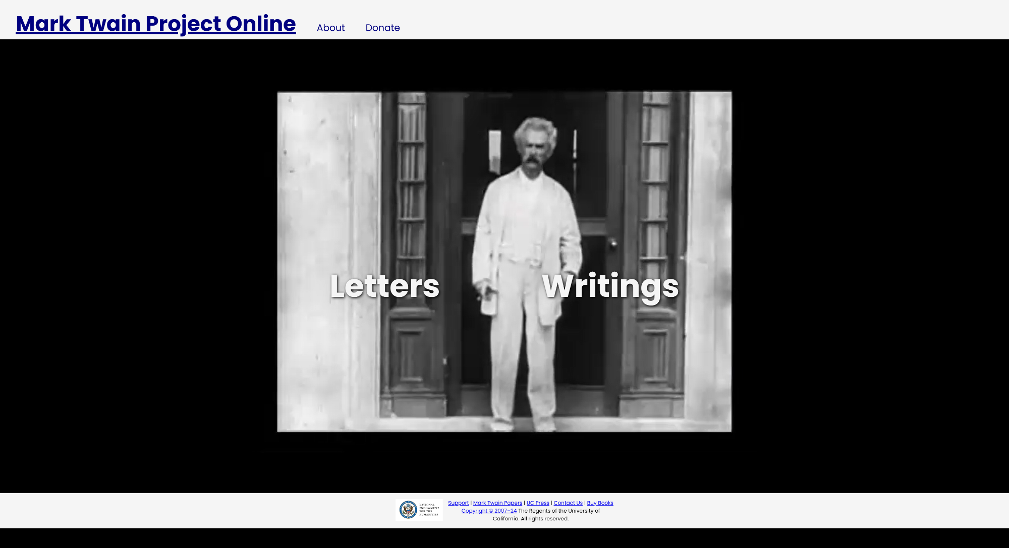 Mark Twain Project Online은 미국의 대표적인 작가 마크 트웨인의 방대한 기록을 디지털화한 아카이브입니다. 마크 트웨인(본명: 새뮤얼 랭혼 클레멘스)은 "톰 소여의 모험", "허클베리 핀의 모험" 등으로 잘 알려진 작가의 유머와 사회적 통찰이 담긴 작품들은 지금까지도 전 세계 독자들에게 사랑받고 있습니다. 아카이브는 트웨인의 작품뿐만 아니라 편지, 일기, 초고 등을 포함하여 그의 문학적 여정을 깊이 있게 탐구할 수 있는 자료들을 제공합니다. 전 세계 누구나 트웨인의 생애와 작품에 쉽게 접근할 수 있도록 하여, 학문적 연구뿐만 아니라 일반 독자들도 트웨인의 독창적인 문학 세계를 경험할 수 있게 합니다. (아카이브 웹사이트 이동 예정 https://beta.marktwainproject.org/)