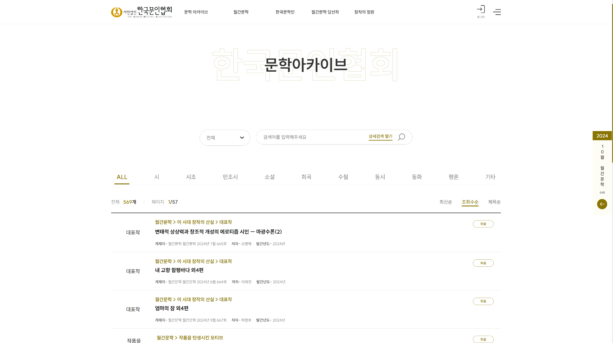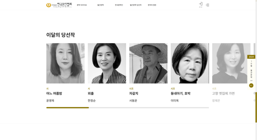 사단법인 한국문인협회에서 만든 월간문학 아카이브는 대한민국 문단의 오랜 역사와 문학적 가치를 보존하고 전파하는 디지털 아카이브입니다. 1955년 창간된 월간문학 잡지의 모든 호를 디지털화하여 제공하며, 현대 한국 문학사의 중요한 기록들을 한 곳에서 확인할 수 있습니다. 다양한 장르의 시, 소설, 평론, 에세이 등 문학 작품을 감상할 수 있으며, 문인들의 창작 활동을 연구하는 데 필요한 귀중한 자료를 제공합니다.