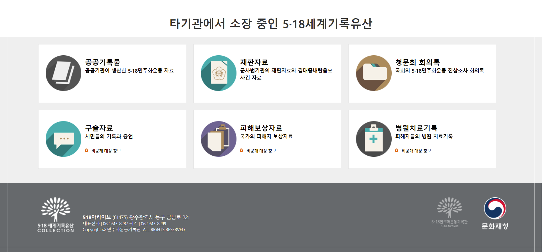 | 변경전 내용 | 5·18 세계기록유산 컬렉션은 1980년 5월 18일부터 27일까지 10일 동안 광주에서 일어난 5·18 민주화운동에 대한 기록 저장소입니다. 민주·인권·평화의 도시 광주가 보여주었던 민주화에 대한 열망을 담은 1980년 5·18민주화운동 기록들은 광주시민들의 노력으로 2011년 유네스코 세계기록유산에 등재되었습니다. 5·18 민주화운동기록관은 5·18 민주화운동에 대한 역사적 기록들을 보존하기 위해 2015년 설립되어 지속적으로 기록물들을 |