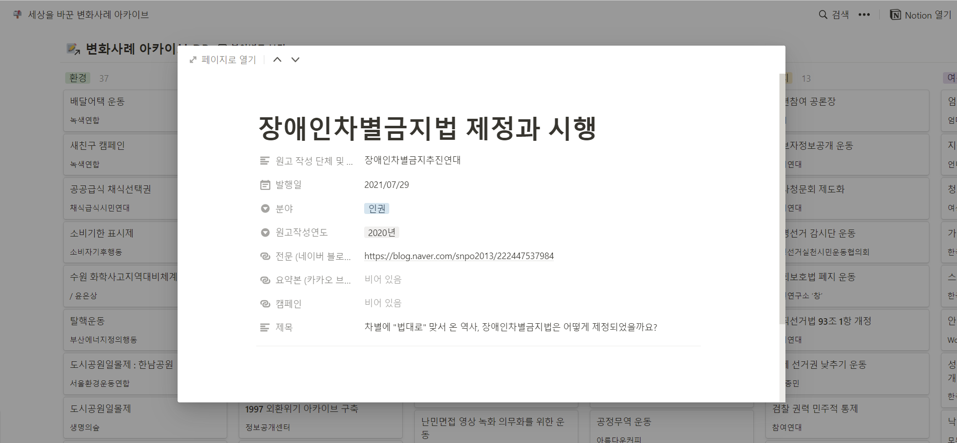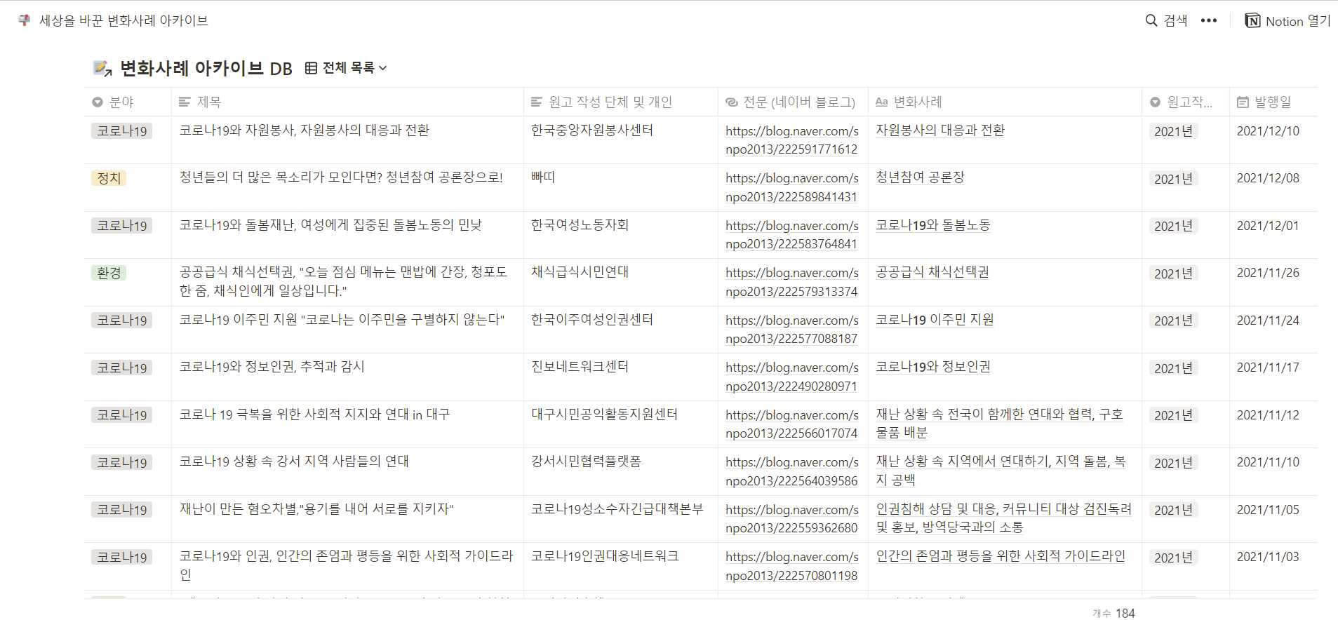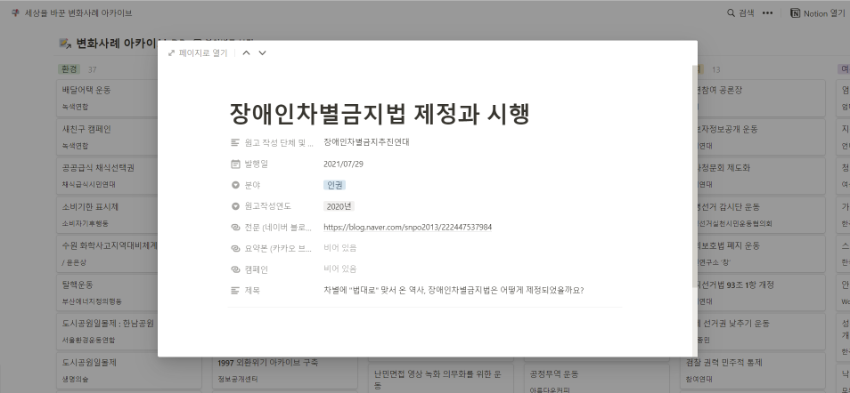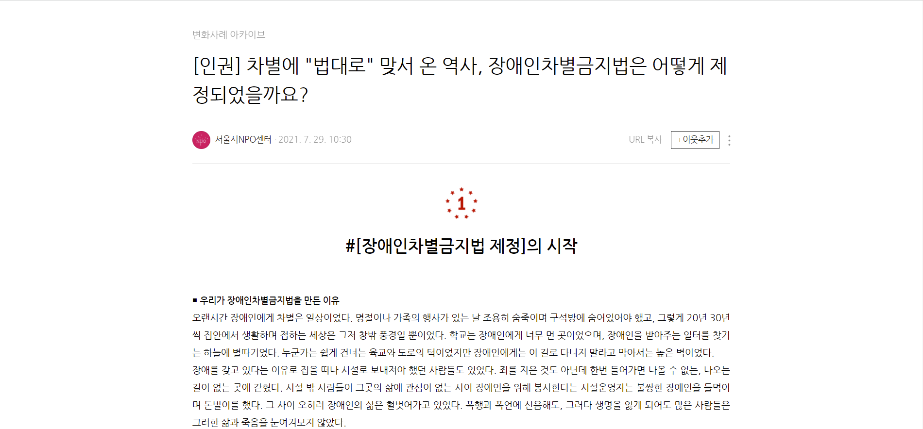 서울시 NPO 지원센터 변화사례 아카이브는 시민사회가 만들어 온 유의미한 성과를 발굴하고 수집하여 기록하는 과정을 통해 NPO의 사회적 가치를 재조명하고, 확산하는 데에 기여하기 위한 디지털 아카이브입니다.
