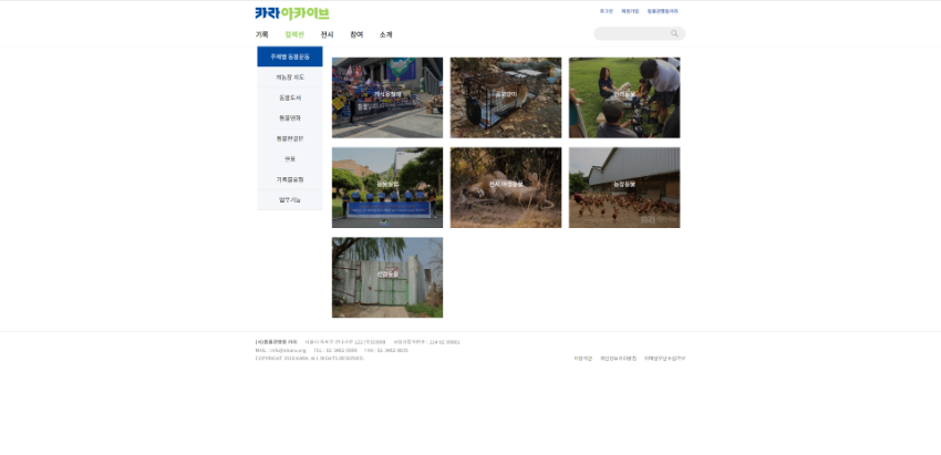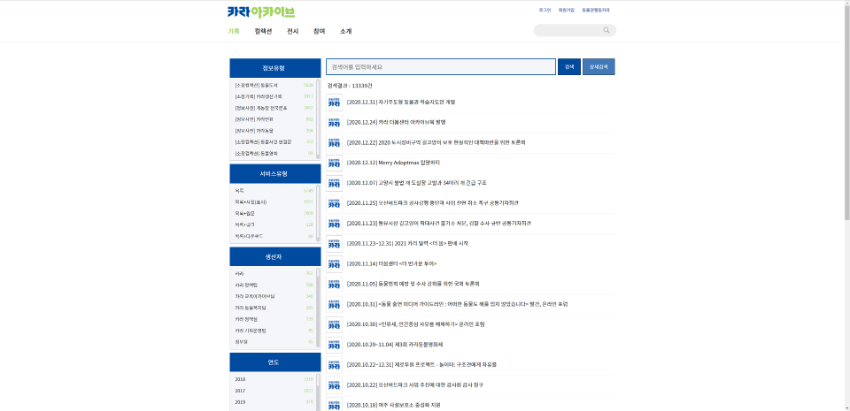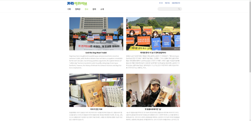 \r\n\r\nhttps://archive.ekara.org/ ","sys_name":"현승인","sys_dt":"20220223100725","formatted_i_editdt":"2022.02.23 10:07:25"},{"i_id":"61219","i_field":"12","i_field_nm":"범위와내용","i_editdt":"20220119174606","i_edittype":"1","i_edittype_nm":"수정","i_before":"카라 동물권 아카이브는 한국 동물운동의 중심에서 활동해온 카라의 자료와 기록을 조사, 수집, 정리, 보존하여 시민들에게 투명하게 공개합니다. 카라는 2002년 ‘아름품’ 설립 초기부터 현재까지 동물보호법 개정 활동과 정책 제안, 교육, 캠페인을 활발하게 펼쳐왔고, 그 과정에서 생산하고 수집한 기록물은 문서, 이미지, 동영상, 사진 자료 등 8만 여점에 달합니다. 아카이브 자료들은 업무기능별, 연표별, 유형별로 찾기 쉽게 분류했으며, 주요 기록들","i_after":"