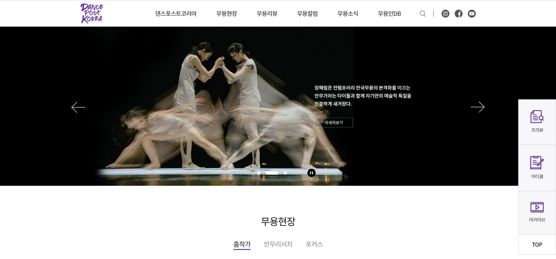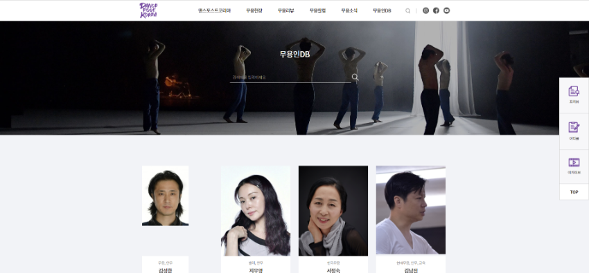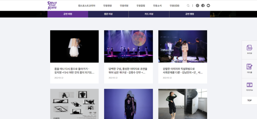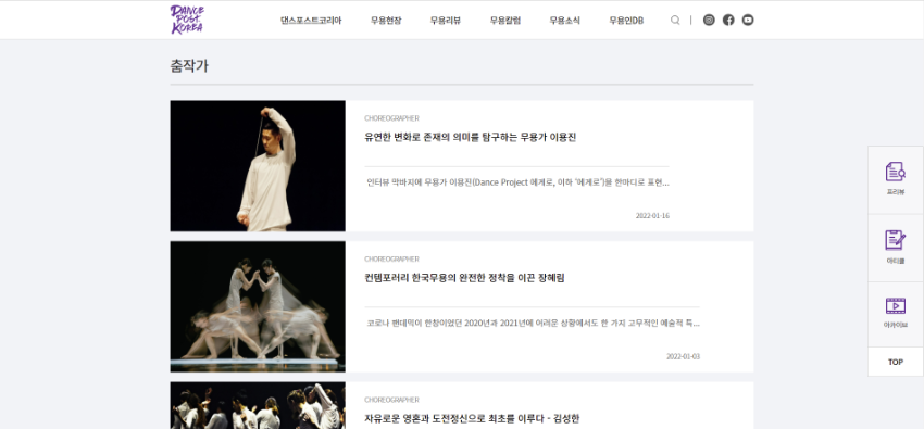 본 웹진은 춤공연 리뷰, 춤작가론, 안무리서치, 집단리뷰, 공연평점, 무용인 DB 등을 통하여 춤의 기록화, 춤의 전문화, 춤의 대중화, 춤의 세계화를 꾀하며 한국무용예술의 진흥과 발전에 공헌함을 목적으로 합니다.