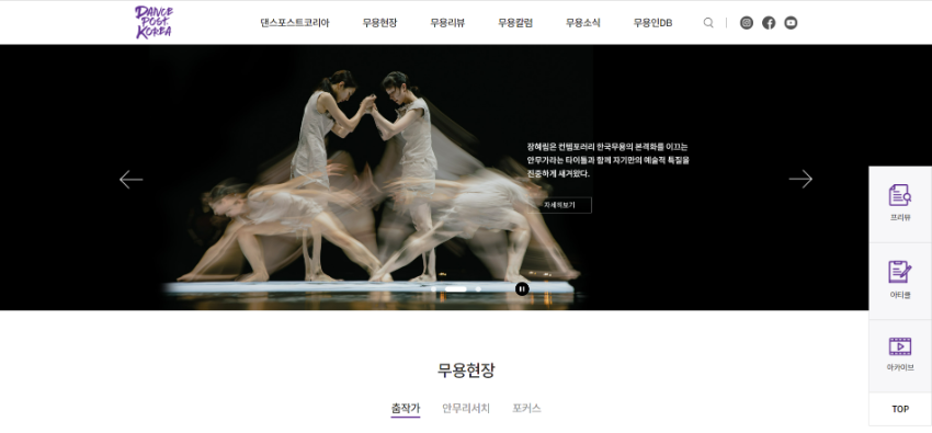 DancePost.Korea는 무용계에 정론을 펼치기 위하여 전문적이고 새로운 시각의 비형과 담론을 제시하고, 한국 춤문화의 어제와 오늘을 기록하는 웹진으로, 2013년 '지금, 여기의 춤기록'을 모토로 출발했습니다.