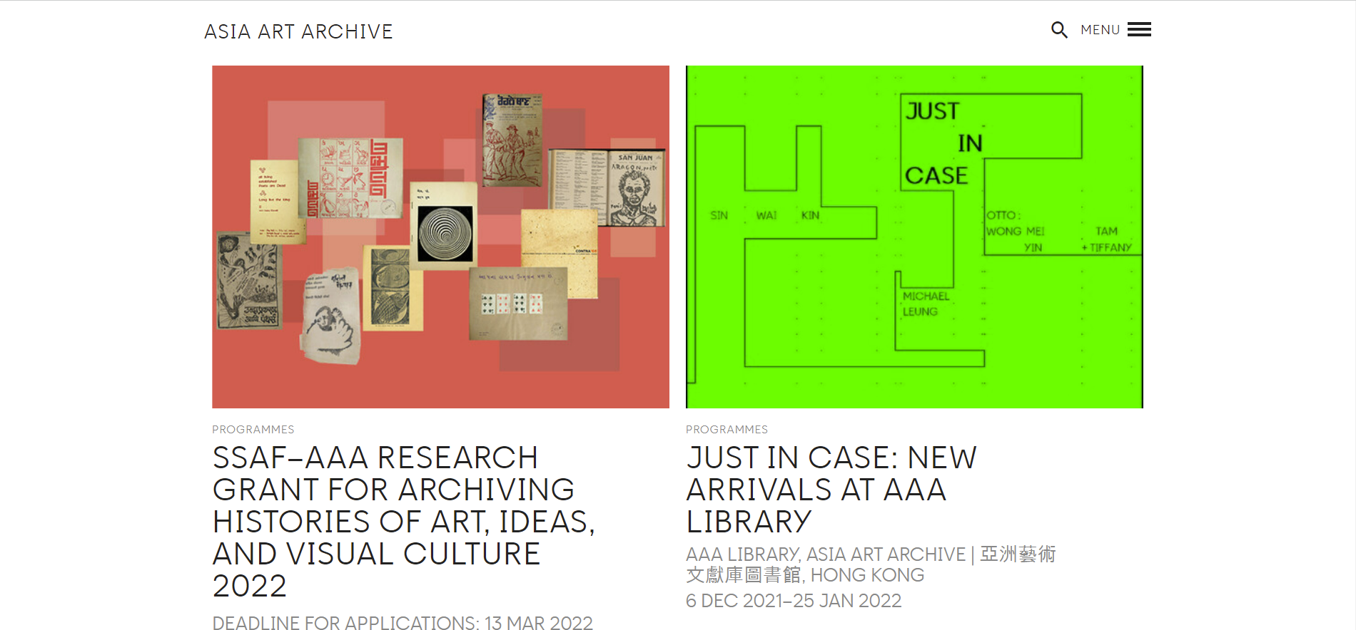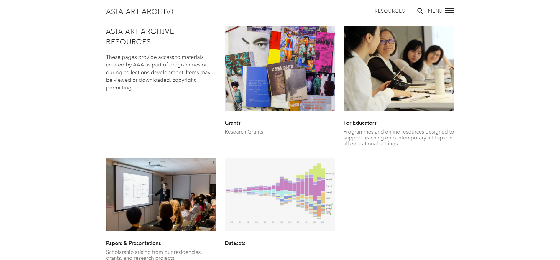 웹사이트와 현장 도서관에서 무료로 이용할 수 있는 아시아 미술의 최근 역사에 관한 가장 가치 있는 성장 자료 컬렉션 중 하나를 통해 AAA는 연구, 레지던시 및 교육 프로그램을 통해 지식을 집합적으로 확장할 수 있는 도구와 커뮤니티를 구축합니다.