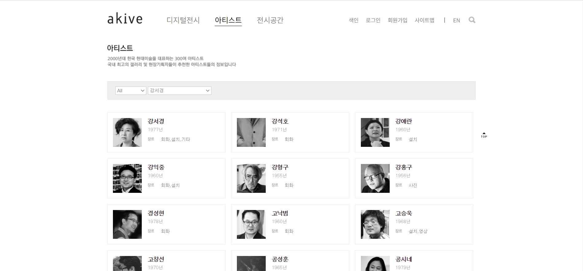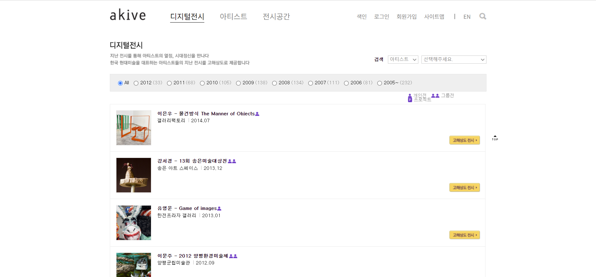 akive의 컨텐츠는 한국 현대미술의 발전을 바라는 미술계의 많은 분들의 관심과 동참으로 만들어졌으며, 계속 진화하고 있습니다. 한국 현대미술 현장을 반영하는 수준 높은 컨텐츠를 오늘날의 커뮤니케이션 환경에 맞게 전달함으로써 미술문화의 발전과 저변 확대에 기여하고자 합니다.