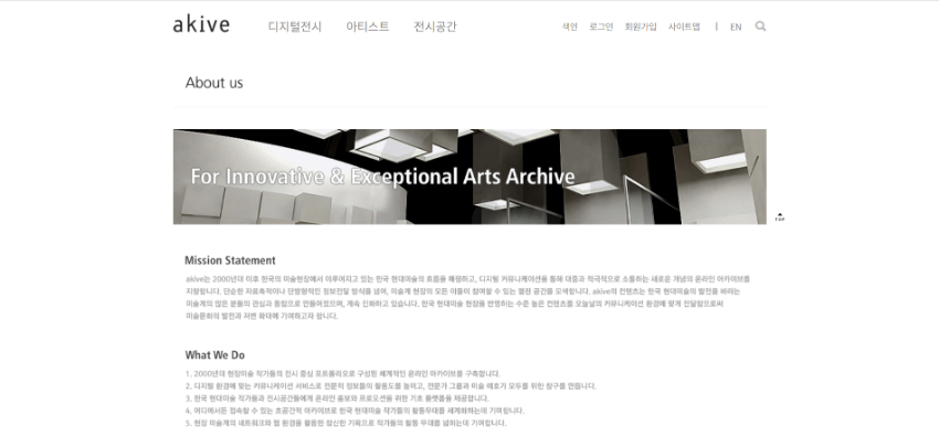 대한민국 현대미술 디지털 아카이브 akive는 2000년대 이후 한국의 미술현장에서 이루어지고 있는 한국 현대미술의 흐름을 매핑하고, 디지털 커뮤니케이션을 통해 대중과 적극적으로 소통하는 새로운 개념의 온라인 아카이브를 지향합니다. 단순한 자료축적이나 단방향적인 정보전달 방식을 넘어, 미술계 현장의 모든 이들이 참여할 수 있는 열린 공간을 모색합니다.