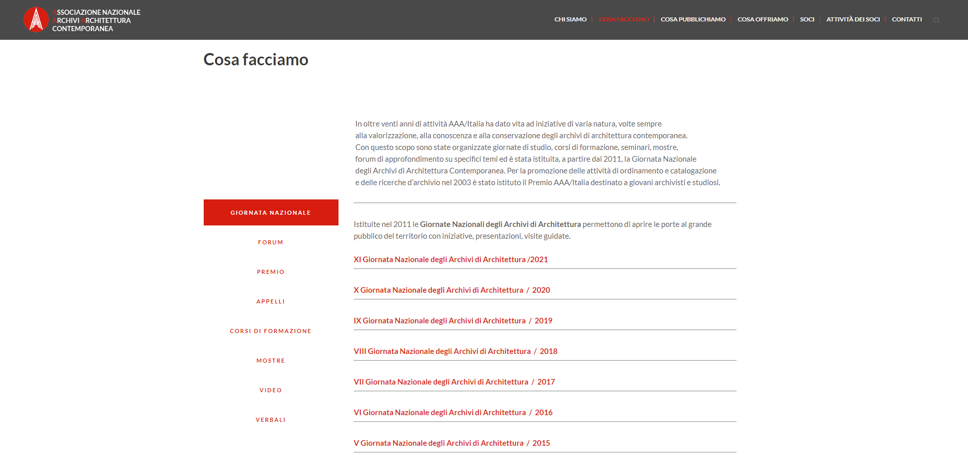 Associazion nazionale Archive Architettura contemporanea(AAA)는 넓은 의미에서 도시와 건축 환경에 관심이 있는 광범위한 대중에게 현대 건축 기록 보관소에 대한 지식을 홍보하기 위해 만들어졌습니다.