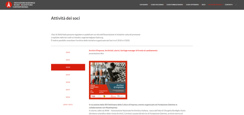 전문가와 전문 협회에 의해 점점 더 발전하는 현대 건축 아카이브의 수집, 관리 및 향상 방법에 대한 정보를 제공합니다. 특별하고 독점적인 교육 프로젝트를 통해 이탈리아에서 현대 건축 기록 보관소를 일상적으로 이용해야 하는 사람들의 지식 향상에 기여하고자 합니다.
