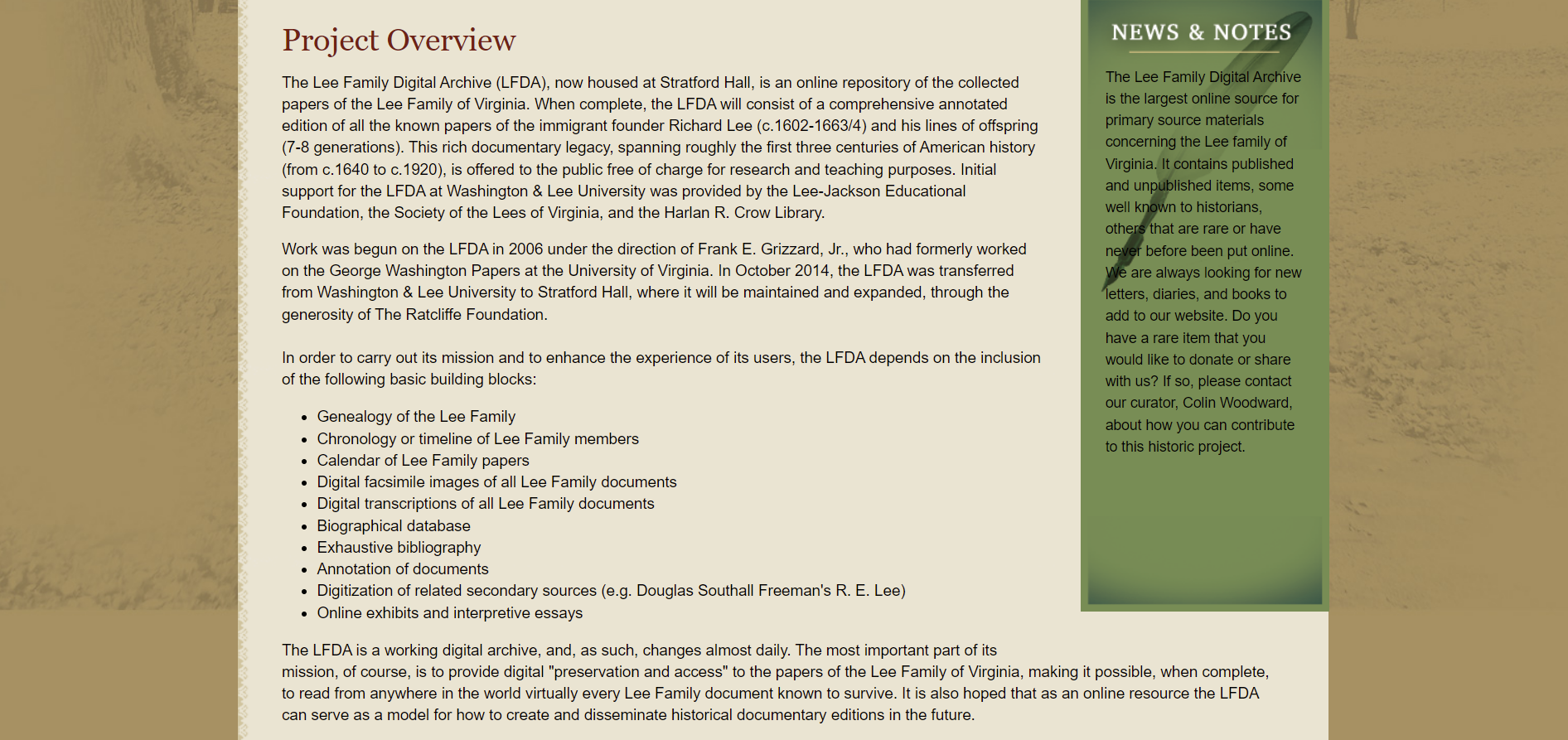 LFDA는 영국에서 미국 버지니아로 이주하여 처음 거주한 Lee Family의 첫 번째 인물인 Richard Lee와 그의 자손(7-8세대)에 대한 자료를 수집하여 연구와 교육 목적으로 대중에게 무료로 제공합니다. LFDA를 위한 업무는 2006년, 버지니아 대학의 the George Washington Papers에서 일했던 Frank E. Grizzard, Jr.의 주도 하에 시작되었으며, 2014년 Stratford Hall로 이관되어 유지되고 확장되고 있습니다.