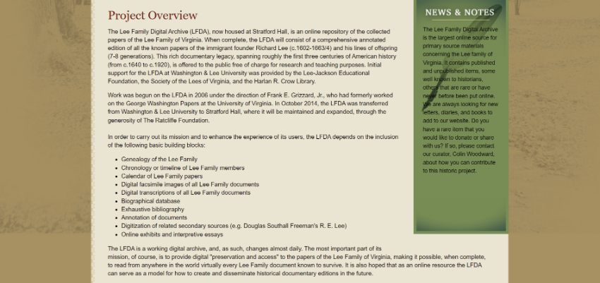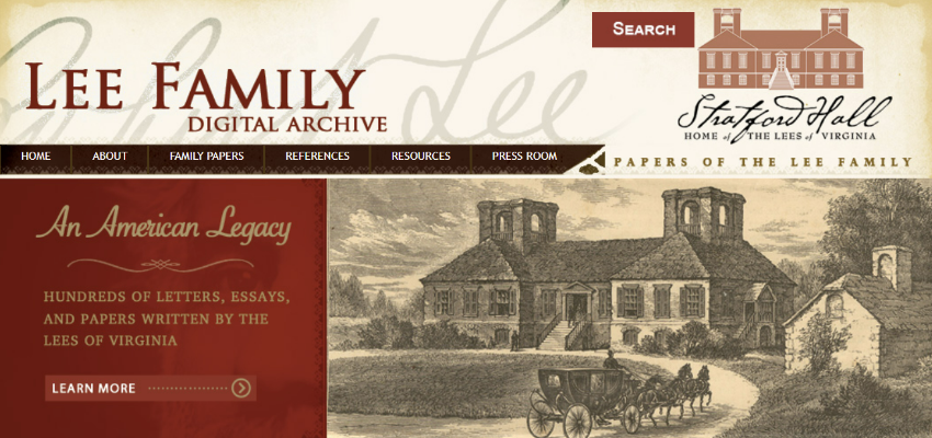 Lee Family Digital Archive(LFDA)는 미국 버지니아의 Lee Family와 관련된 논문 및 자료를 수집하고 정리하여 제공하고 있습니다. 출판되지 않은 항목도 일부 포함하고 있으며, 많이 알려지지 않았던 희귀한 자료들도 살펴볼 수 있습니다.