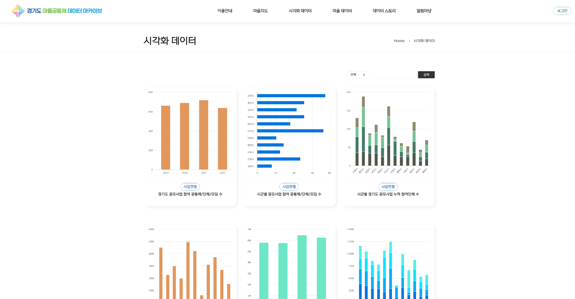"경기도 마을공동체 자원과 정성적, 정량적 성과를 종합적으로 확인하고 마을 데이터를 공유하는 서비스입니다. 경기도 마을공동체 기초조사를 활용한 마을 정보 및 시각화를 제공하고, 경기도 마을공동체 데이터 관리 솔루션 기능을 서비스하며, 경기도 마을공동체 정책자료 산출 및 인사이트를 도출합니다."