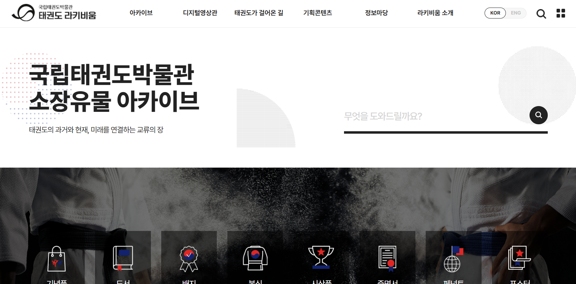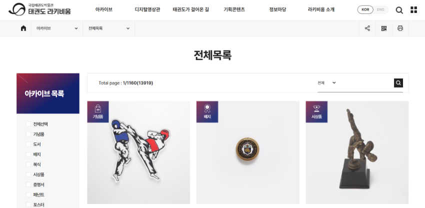 "국립태권도박물관이 수집한 다양한 태권도 관련 소장자료들을 확인하실 수 있습니다. 기념품, 도서, 배지, 복식, 시상품, 증명서, 페넌트, 포스터 등 분류를 선택하거나 검색을 통해 원하시는 정보를 찾아볼 수 있습니다. 소장자료는 이미지로 확인하실 수 있고, 국적-시대, 년대, 입수처 등의 상세 정보로도 검색이 가능합니다."