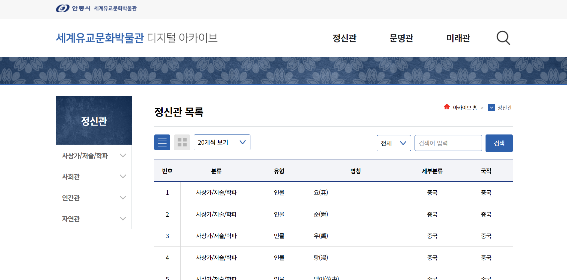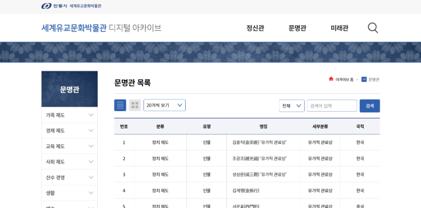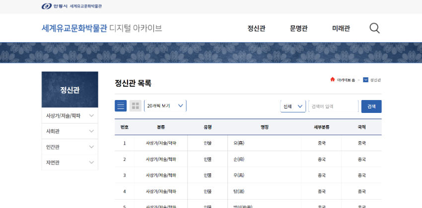 아카이브 바로가기 유교지식 디지털아카이브에서는 유교문화 관련 인물과 제도, 서적, 관습 등 방대한 자료들을 집대성하여 이용자들에게 제공하고 있습니다.