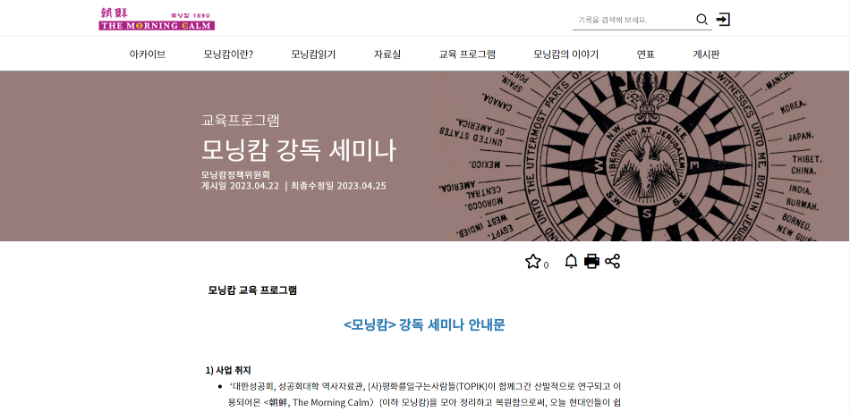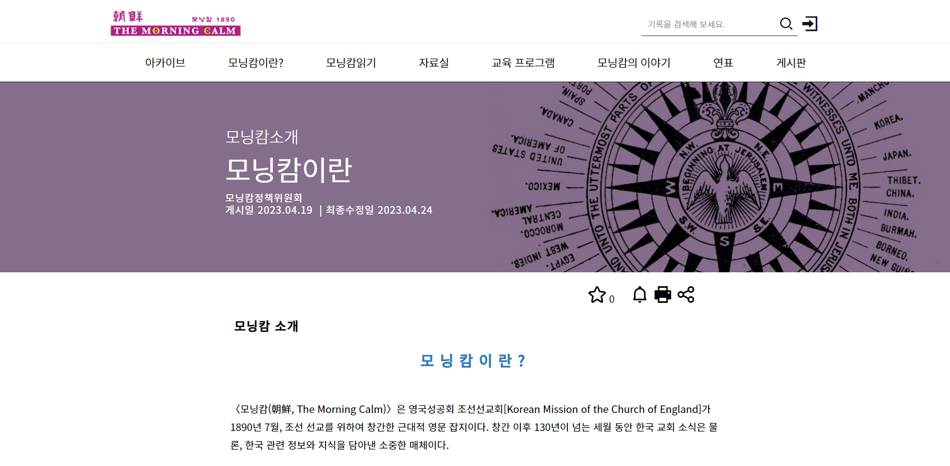 1890년부터 발간된 대한성공회 선교지 <朝鮮, The Morning Calm>을 오늘에 되살려, 많은 사람이 편리하게 접근하여 배움을 얻고 영감을 받으며 이를 자양분으로 삼아 신앙심을 고취하고 문화의 꽃을 피우기를 희망합니다.