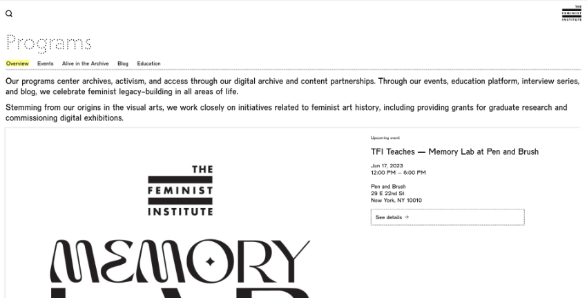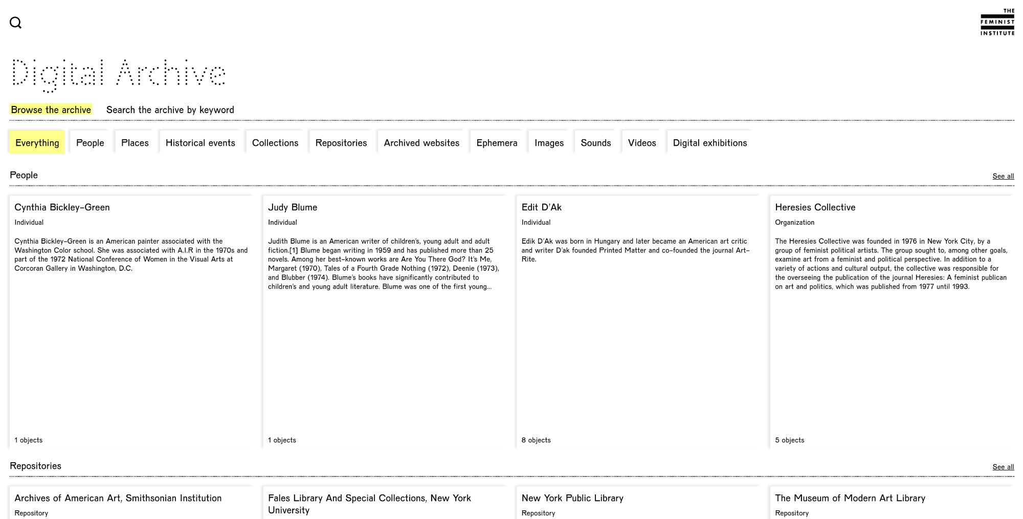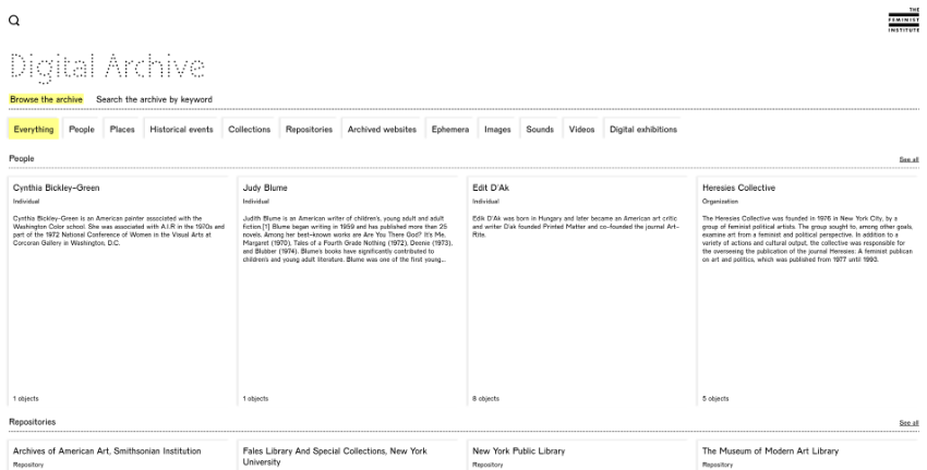 "Feminist Institute(TFI)는 대중이 접근할 수 있도록 아카이브 자료를 보존하고 디지털화하여 문화에 대한 페미니스트의 기여를 기록하고 기념합니다. TFI는 더 완전한 진실을 반영하기 위해 문화 기록을 채워 정보 활동주의와 성평등을 촉진합니다.