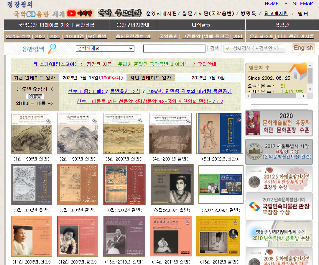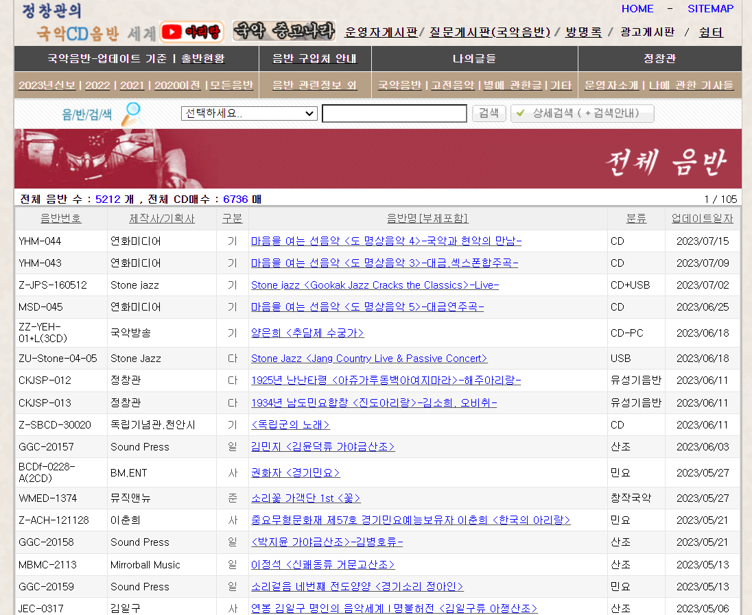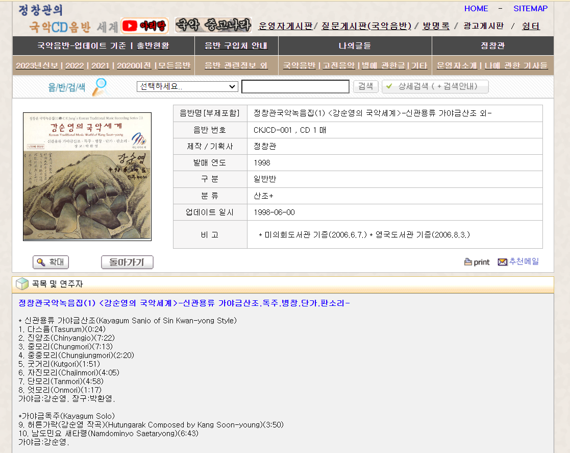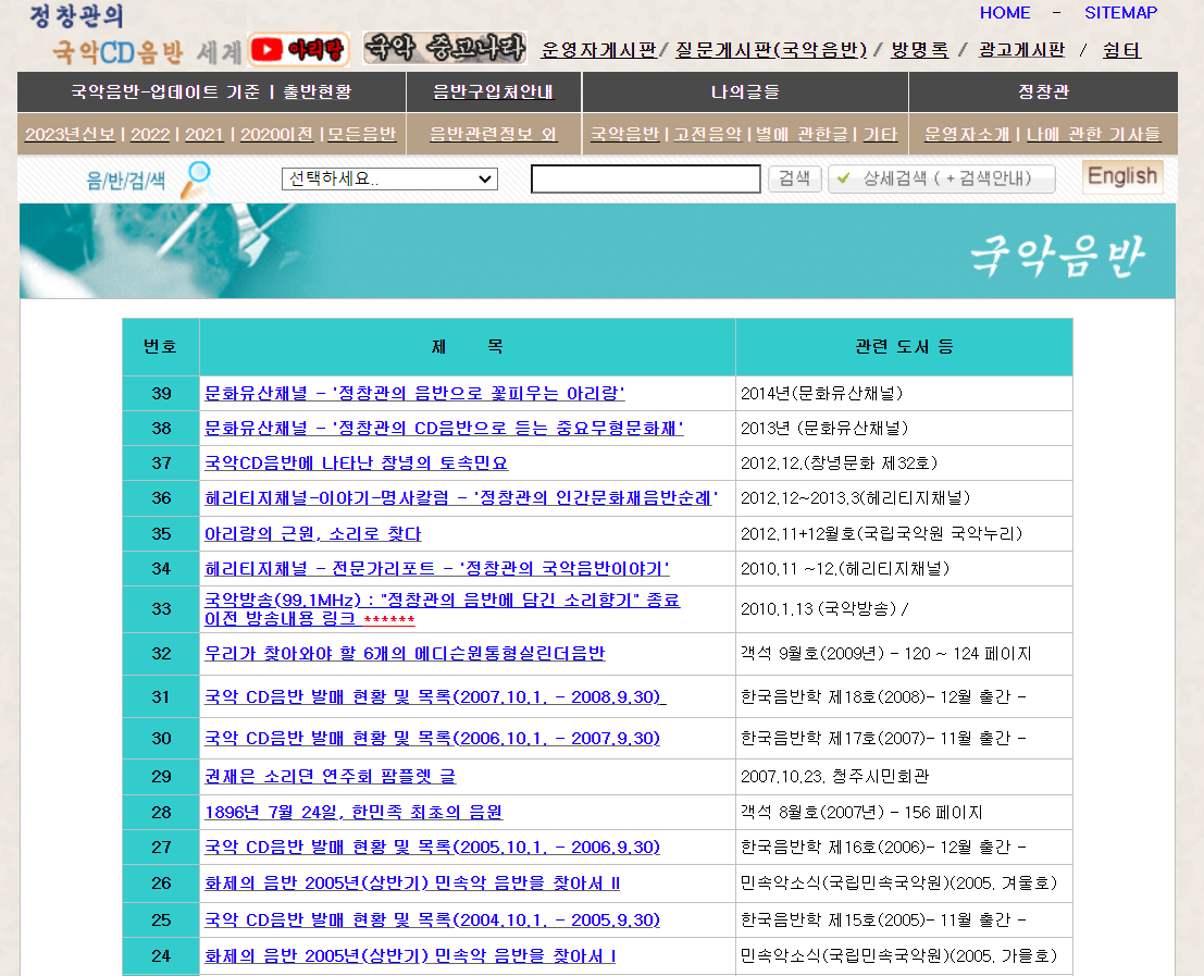 한국고음반연구회 정창관 부회장이 운영하는 '정창관의 국악 음반 세계'는 세상의 모든 국악CD음반을 데이터베이스화하는 것을 목표로 구축한 웹사이트이다.