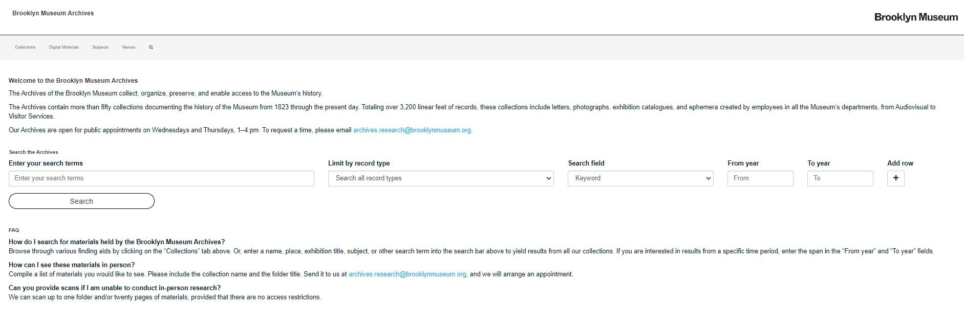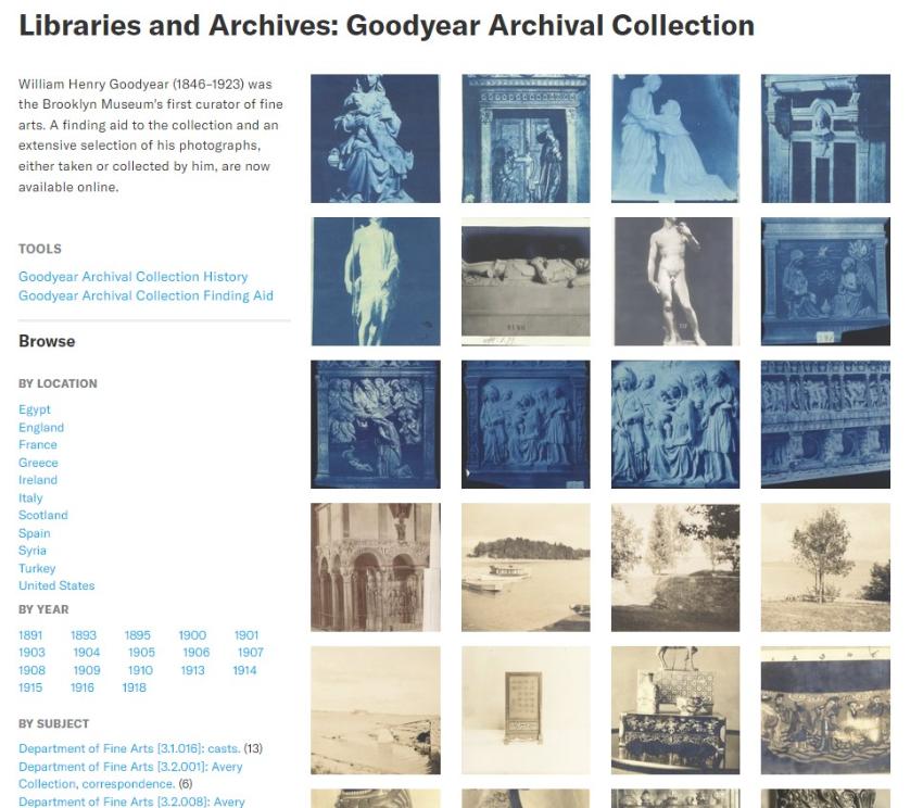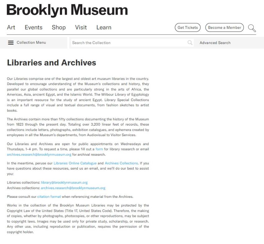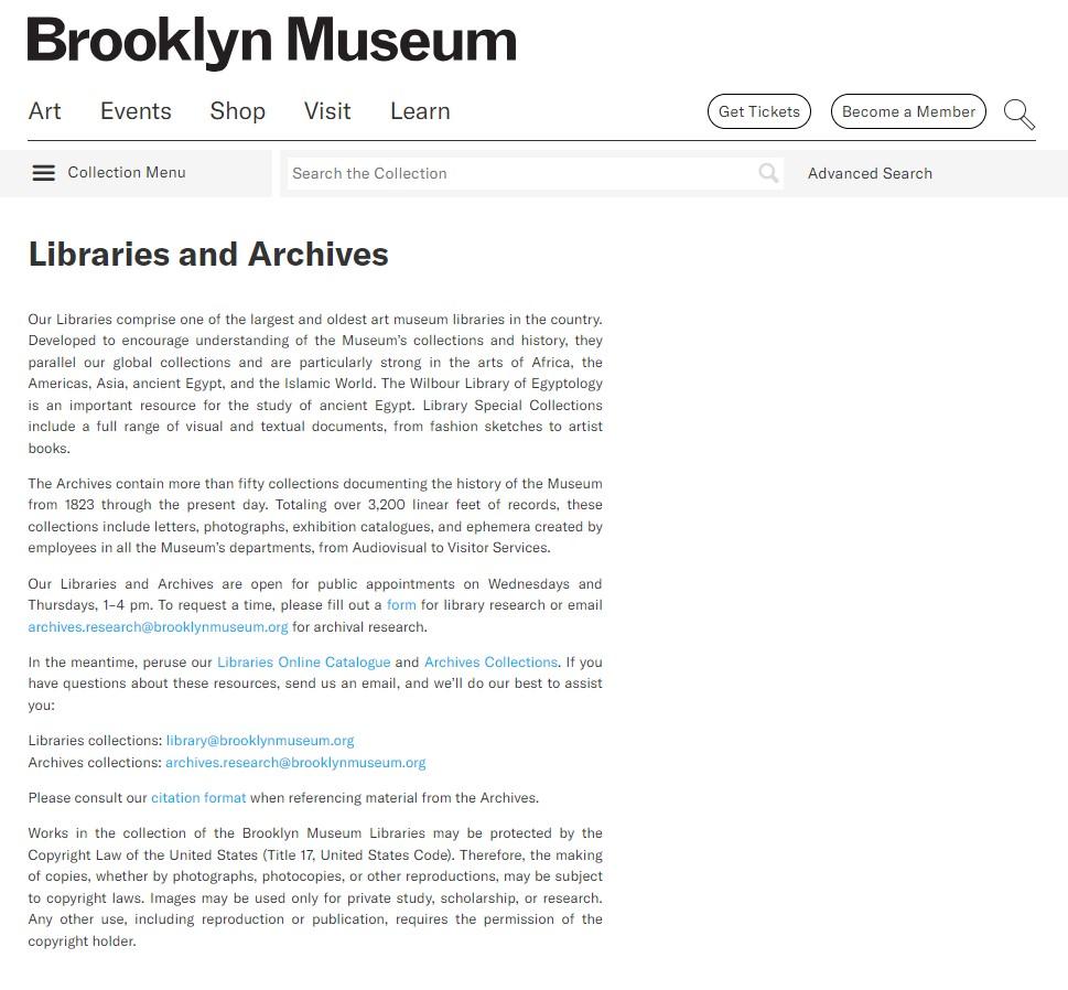 브루클린 박물관 아카이브에는 1823년부터 현재까지 기록한 50여개 이상의 소장품이 있습니다. 본 아카이브에는 시청각 자료와 방문객 서비스에 이르기까지 박물관의 모든 부서에서 생산한 기록을 소개하고 있습니다.