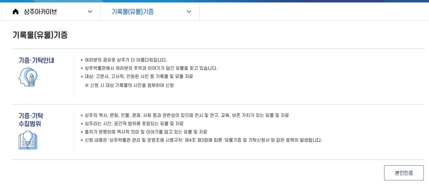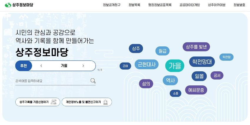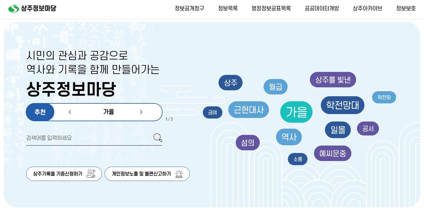 상주시는 2020년 역사기록관리시스템을 구축하고, 2021년부터 매년 민간 기록물 수집을 위한 '상주 역사기록 찾기' 공모전을 수행했다. 2022년 역사기록관리시스템에 관리 중인 기록물을 분류하고 홈페이지와 연계하는 아카이브 서비스 체계 구축을 완료했다.