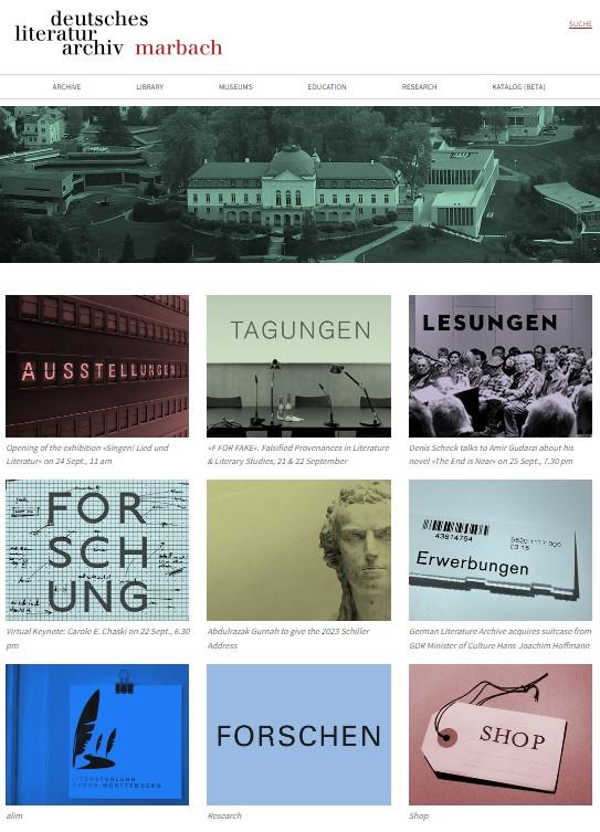 "독일 문학 아카이브(Deutsches Literaturarchiv – DLA)는 세계에서 가장 중요한 문학 기관 중 하나입니다. 이 컬렉션은 1750년부터 현재까지의 문학 및 지적 역사에 대한 귀중한 자료를 풍부하게 모아 보존하고 있습니다. 1955년 설립 이후 문학, 교육 , 연구 활동을 펼쳐왔습니다. 컬렉션은 자료 비평을 수행하는 모든 사람에게 열려 있습니다.