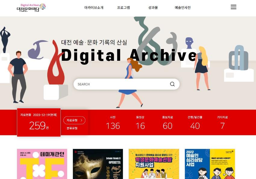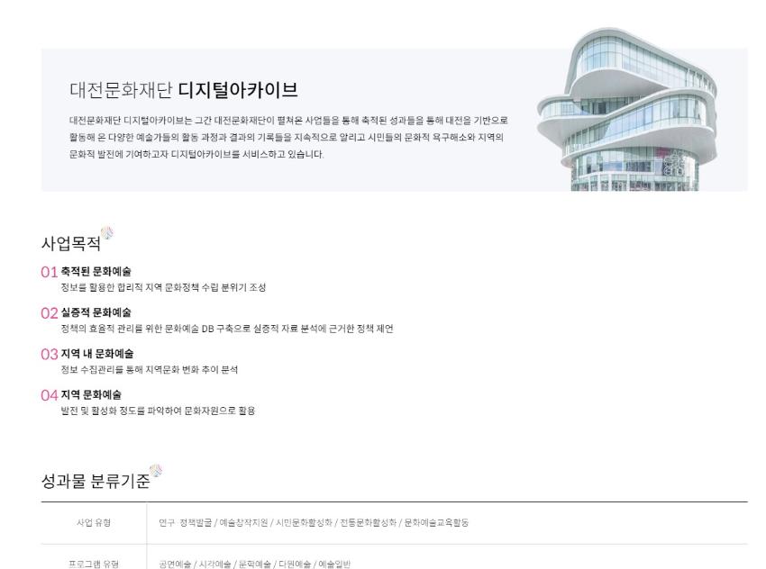 대전문화재단 디지털아카이브는 그간 대전문화재단이 펼쳐온 사업들을 통해 축적한 성과를 바탕으로 대전 기반으로 활동한 다양한 예술가들이 활동 과정과 결과를 지속적으로 알리고 시민의 문화적 용구해소와 지역의 문화발전에 기여하고자 본 서비스를 진행하고 있다.